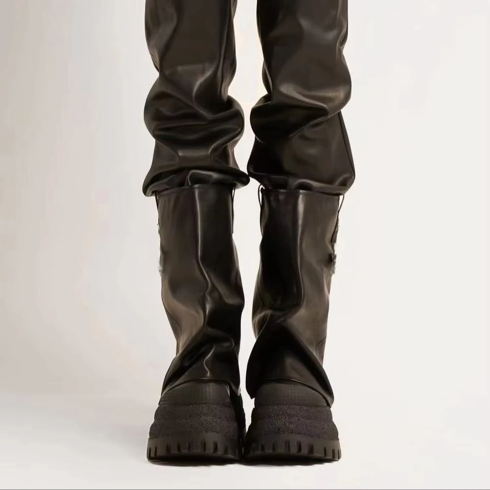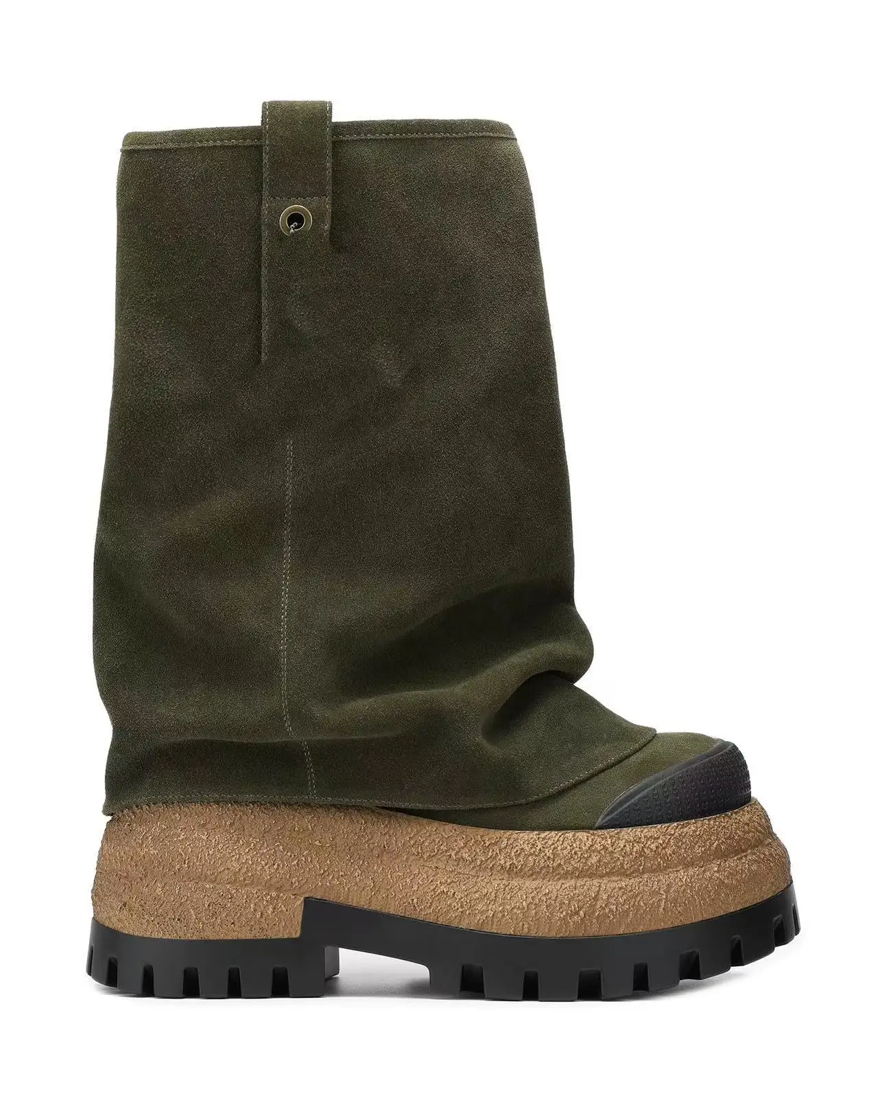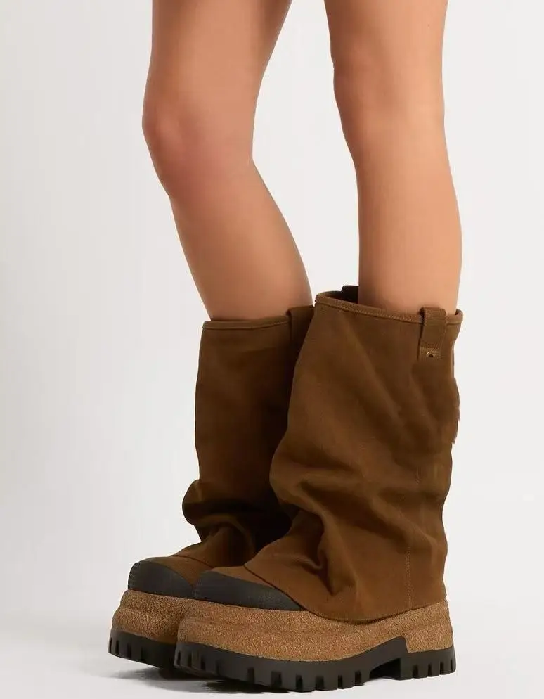 For Busy Girl QD06 Women's Brown Suede Mid-Calf Ankle Boots with Wrinkled Texture Rubber Lug Sole and Side Metal Buckle